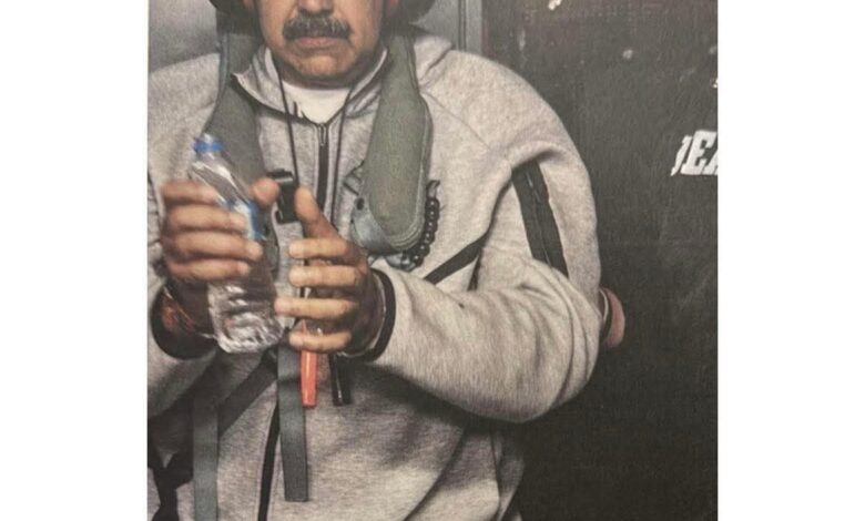 نشر الرئيس الأمريكي دونالد ترامب عبر منصة تروث سوشيال، صورة لاعتقال الرئيس الفنزويلي نيكولاس مادورو، على متن حاملة الطائرات الأمريكية «USS Iwo Jima»، وهو مكبّلًا ومرتديًا بدلة رياضية رمادية من نايكي، ويمسك بزجاجة ماء.