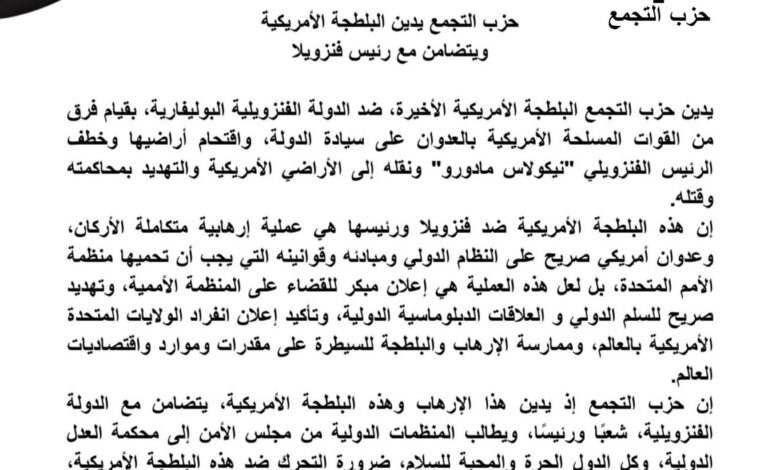 إن حزب التجمع إذ يدين هذا الإرهاب وهذه البلطجة الأمريكية، يتضامن مع الدولة الفنزويلية، شعبًا ورئيسًا، ويطالب المنظمات الدولية من مجلس الأمن إلى محكمة العدل الدولية، وكل الدول الحرة والمحبة للسلام، ضرورة التحرك ضد هذه البلطجة الأمريكية، وضرورة التدخل السريع لإنقاذ الرئيس مادورو، والحفاظ على حياته، وعودته إلى بلاده سالمًا ومعززًا.